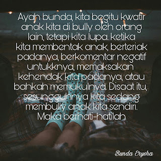 Ayah bunda, banyak dari kita yang tidak menyadari ketika kita memberikan komentar-komentar negatif pada anak kita, sesungguhnya kita sedang membully anak kita sendiri secara verbal dan secara psikis. Untuk itu berhati-hatilah dalam berkata-kata pada anak.