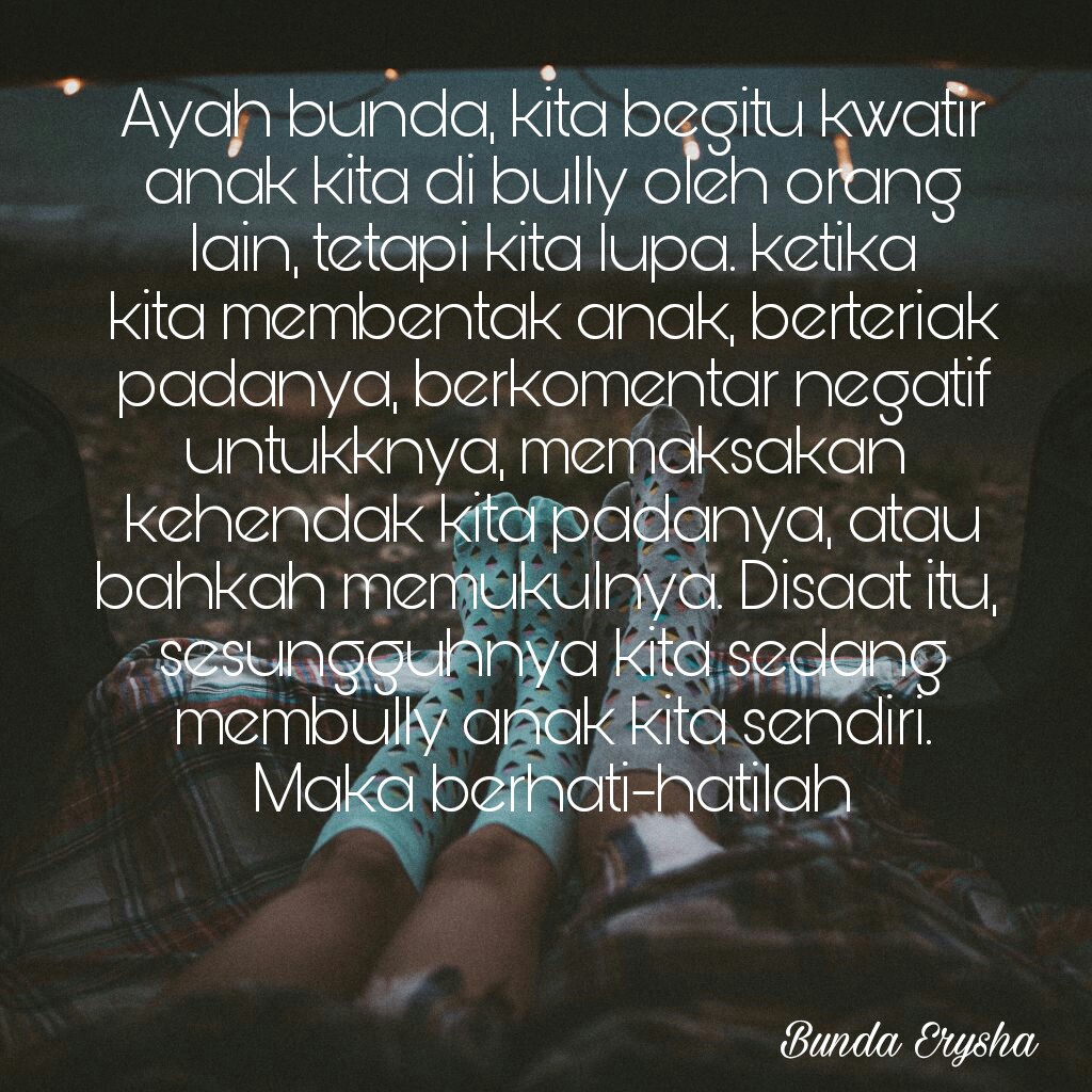 Ayah bunda, banyak dari kita yang tidak menyadari ketika kita memberikan komentar-komentar negatif pada anak kita, sesungguhnya kita sedang membully anak kita sendiri secara verbal dan secara psikis. Untuk itu berhati-hatilah dalam berkata-kata pada anak.