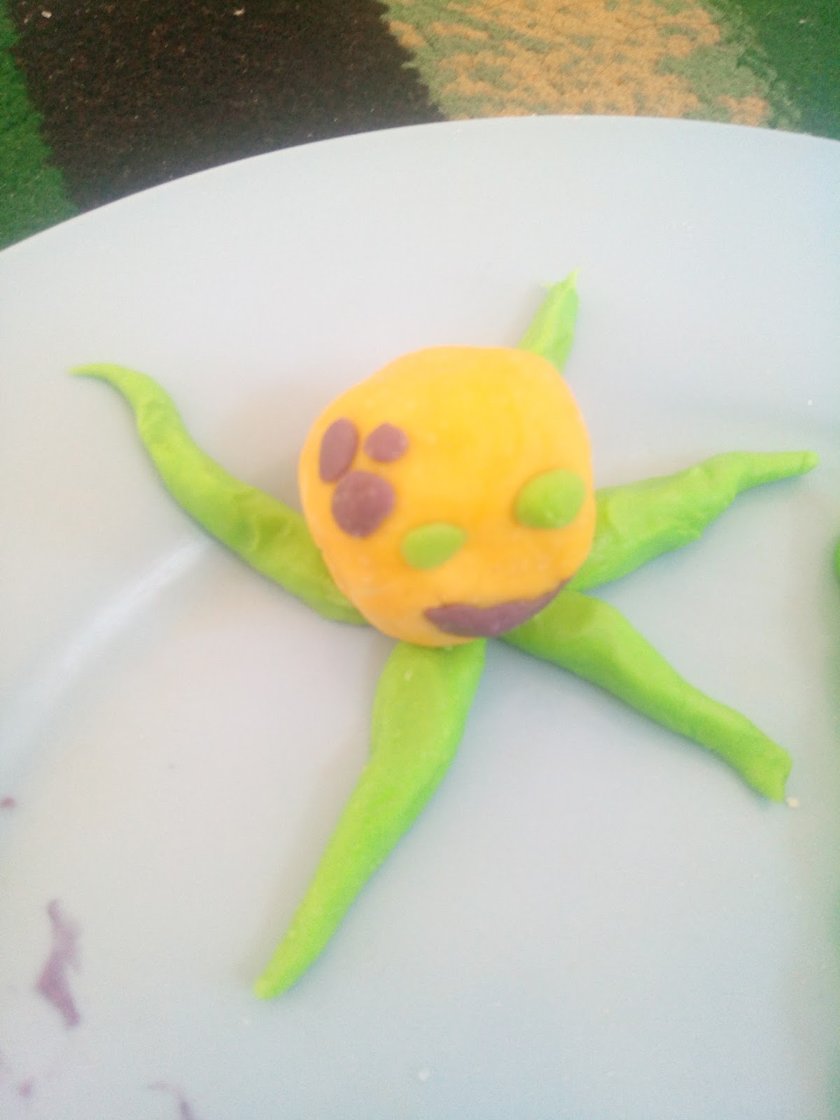 Nah karena saya ingin mengenalkan Erysha dengan bentuk ulat dan gurita, Jadi saya buatlah playdoughnya berbentuk ulat dan gurita. Erysha terlihat senang sekali, karena warna dan bentuknya menarik bagi Erysha sehingga membuat Erysha tidak sabar untuk memakannya. Hehehe. Untung playdoghnya buat sendiri
