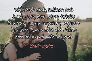 Ayah bunda, luangkanlah waktu bersama anakmu, kerena kebutuhan anak bukan hanya makan, punya tempat tinggal, dan pakaian. Tetapi juga butuh untuk ditemani, butuh tempat berbagi, butuh pengakuan dan butuh merasa dicintai. Temanilah mereka, bacakan buku cerita untuk mereka, bermainlah dengan mereka, dengarkan cerita2 mereka, tertawalah bersama mereka dan hadirlah disaat-saat mereka membutuhkanmu. Jangan mengabaikan perasaan mereka. Karena masa kecil mereka tak akan pernah terulang kembali. Perlakuan mereka di masa mendatang terhadapmu tergantung kamu memperlakukan mereka dimasa kanak2nya. Untuk itu jadilah sebaik-baik orang tua bagi anak-anakmu.