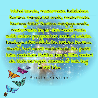 Percayalah ketika mereka telah pergi dari rumah kita. Kita akan merindukan masa-masa lelah itu bersama mereka. Kita akan rindukan  kamar yang selalu berantakan itu, ruang tamu yang dahulu sering kita keluhkan itu, teriakan dan tangisan anak yang selalu menjengkelkan itu,  akan sunyi seperti tak berkehidupan. Lalu terbayang suara dan tangisan mereka dahulu yang kelak menjadi kita rindukan di hari tua kita. Ingatlah itu semua bunda