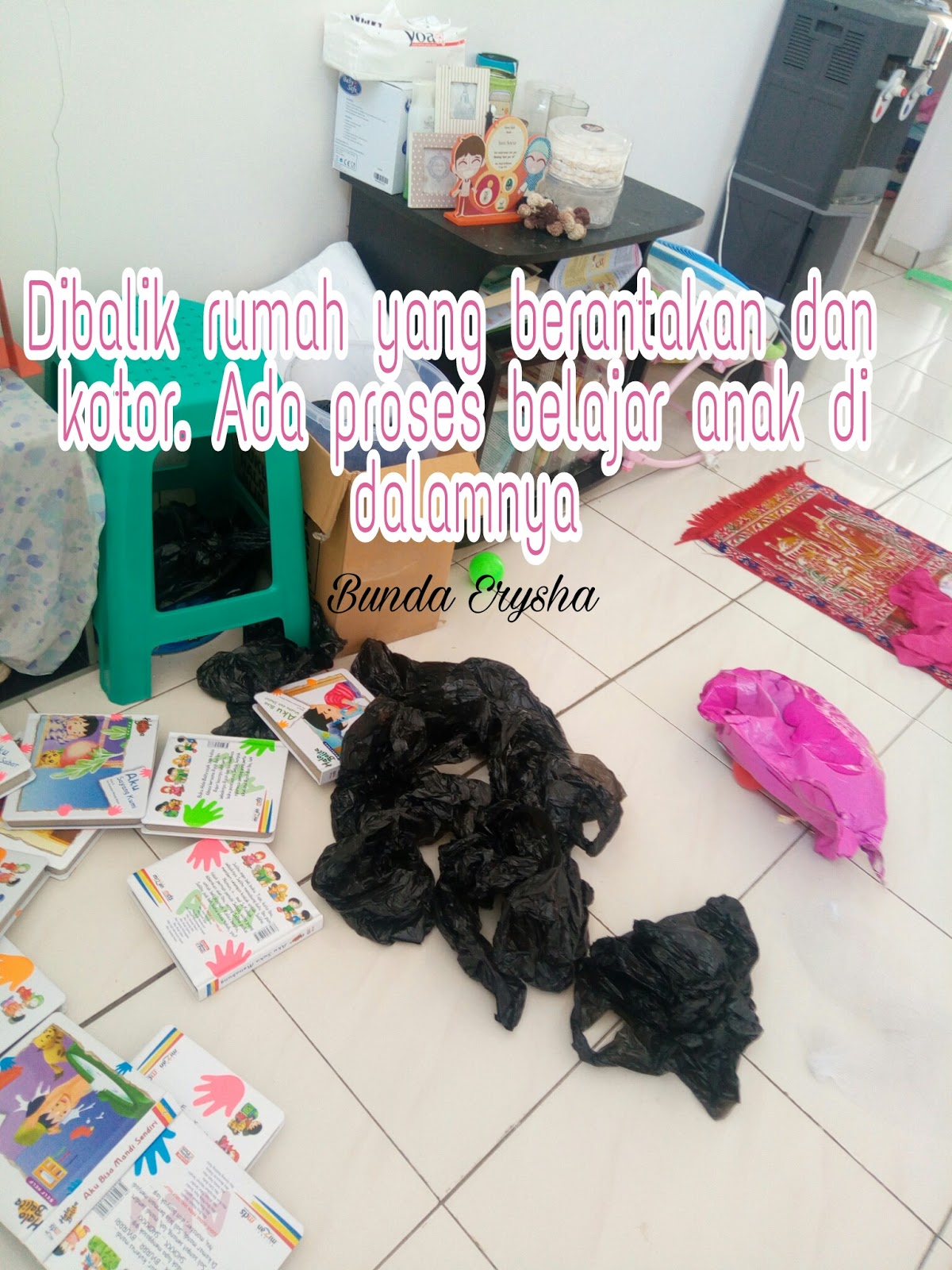 Wahai bunda bersabarlah dengan rumah yang tak pernah pernah rapih dan bersih itu. Karena memang anak sedang fasenya senang bereksplore ini itu, mencoba ini itu dan aktif ke sana kemari tanpa banyak rasa takut. Jangan kita matikan rasa ingin tahu anak dengan banyak melarangnya, banyak membatasi geraknya, mematikan kreativitasnya untuk mencoba banyak hal, dan memarahinya.