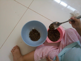 Banyak cara saya untuk menstimulus aspek sensori Erysha. Seperti, memberikannya kacang hijau untuk ia pegang dan pindahkan, membiarkan Erysha membantu saya mengupas telur rebus, walau sebenarnya malah pekerjaan saya yang menjadi bertambah karena harus membereskan sisa kulit telurnya atau harus ikhlas telurnya hancur karena diremas-remas oleh Erysha 😂😂😂.