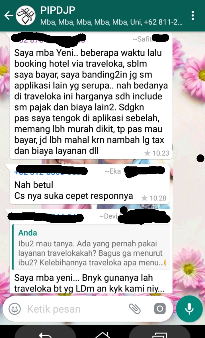 Tapi kan, ya saya nggak mau langsung percaya juga dengan Traveloka ini. Takutnya cuma iklannya aja yang bagus tapi pas mencoba layanannya nggak sebagus iklannya hahaha. Akhirnya, saya tanya-tanya dong ke grupnya emak-emak di watshapp tentang traveloka ini. Ini nih screenshotnya
