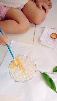5. Ajak anak mengecat gambar buah jeruk yang sudah ditaburi beras dan di cat dengan pewarna makanan