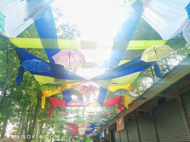 Oh iya, aku dateng pagi-pagi nih. Jadi belum ramai. Ketika kita awal masuk tempat ini, kita akan di sambut dengan hiasan payung warna warni yang menghiasi langit-langitnya dan di pinggir-dipinggirnya banyak ruko pedagang.