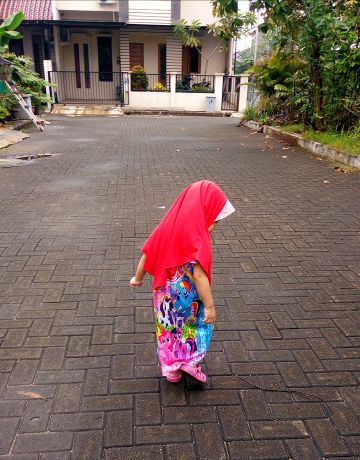 Setiap pagi atau sore, saya suka mengajak Erysha jalan-jalan keliling komplek. Sambil jalan-jalan saya bisa mengenalkan Erysha pada lingkungan di sekitarnya, belajar dari apa yang ia temui di jalan seperti tumbuhan dan berbagai macam hewan untuk menstimulasi kecerdasan naturalisnya, dan mengajaknya untuk bertemu dengan banyak orang untuk menstimulasi kecerdasan interpersonalnya dan melatih rasa percaya dirinya
