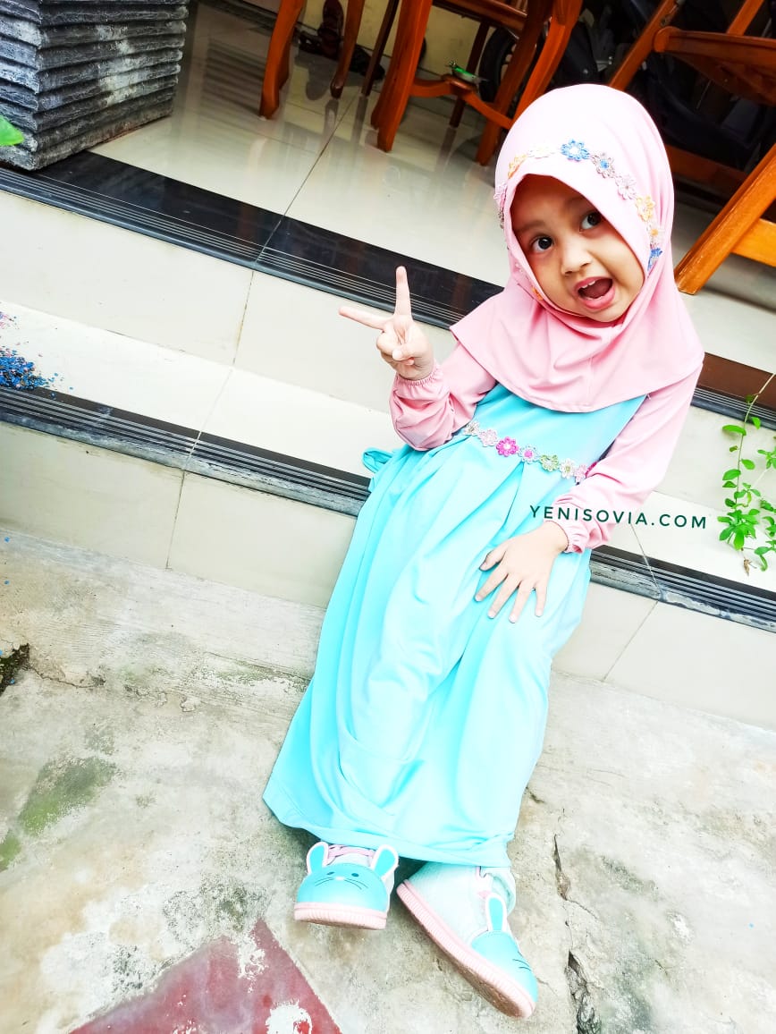 Yang bikin aku suka ama gamisnya itu kerena desainsnya sederhana tapi anggun. Aku juga suka sama jilbabnya karena ada bunga-bunganya itu. Jadi menambah daya tarik si baju apalagi yang pakainya manis juga. Jadi makin manis kan hahaha 😂 *muji anak sendiri aku, biarin 😜