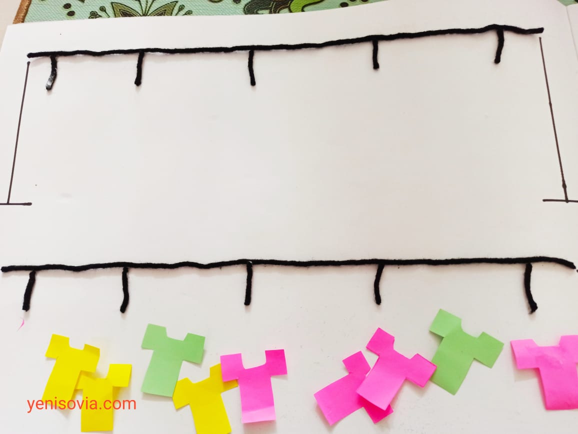 2. Kita buat jemurannya di kertas HVS dengan spidol hitam dan benang wol.