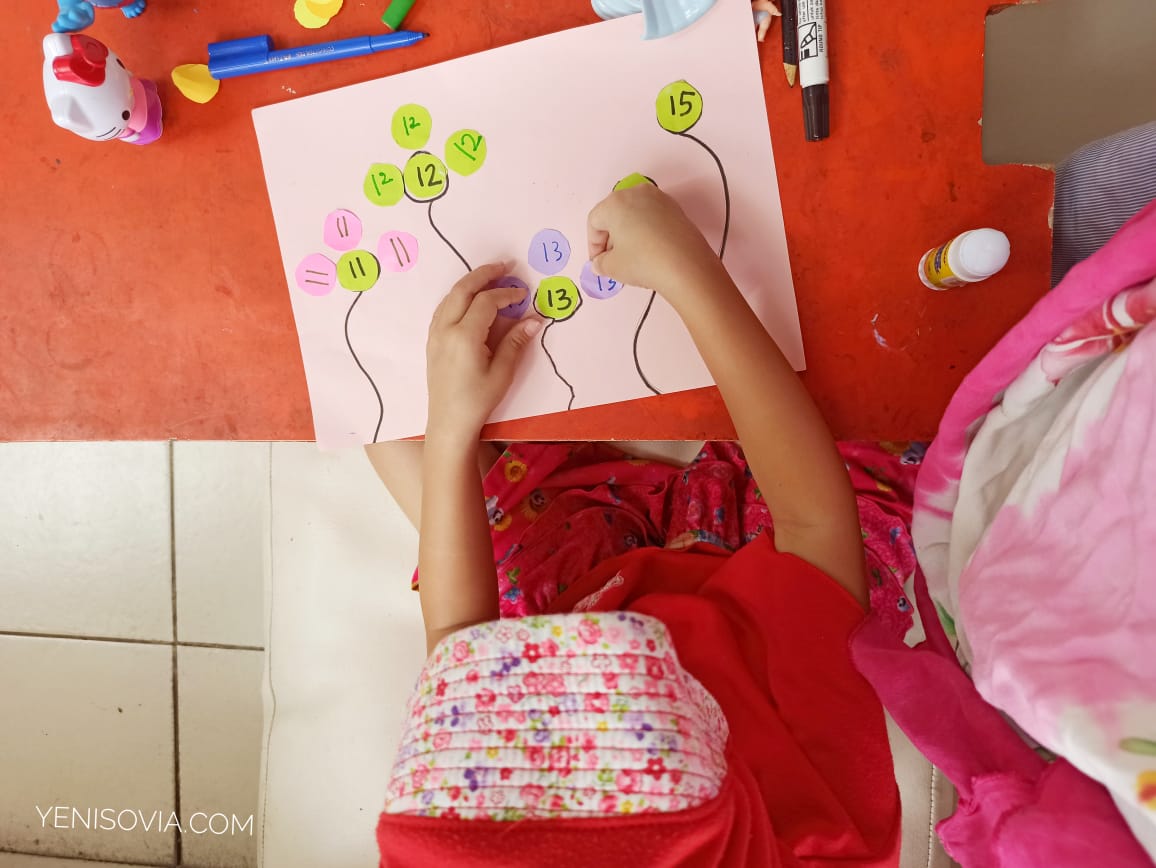 Nah, karena Erysha sudah mengenal dan tahu angka 1 - 10. Jadi, beberapa waktu yang lalu aku kenalkan angka baru yaitu 11 - 15 dengan kegiatan kreativitas yaitu membuat bunga angka.