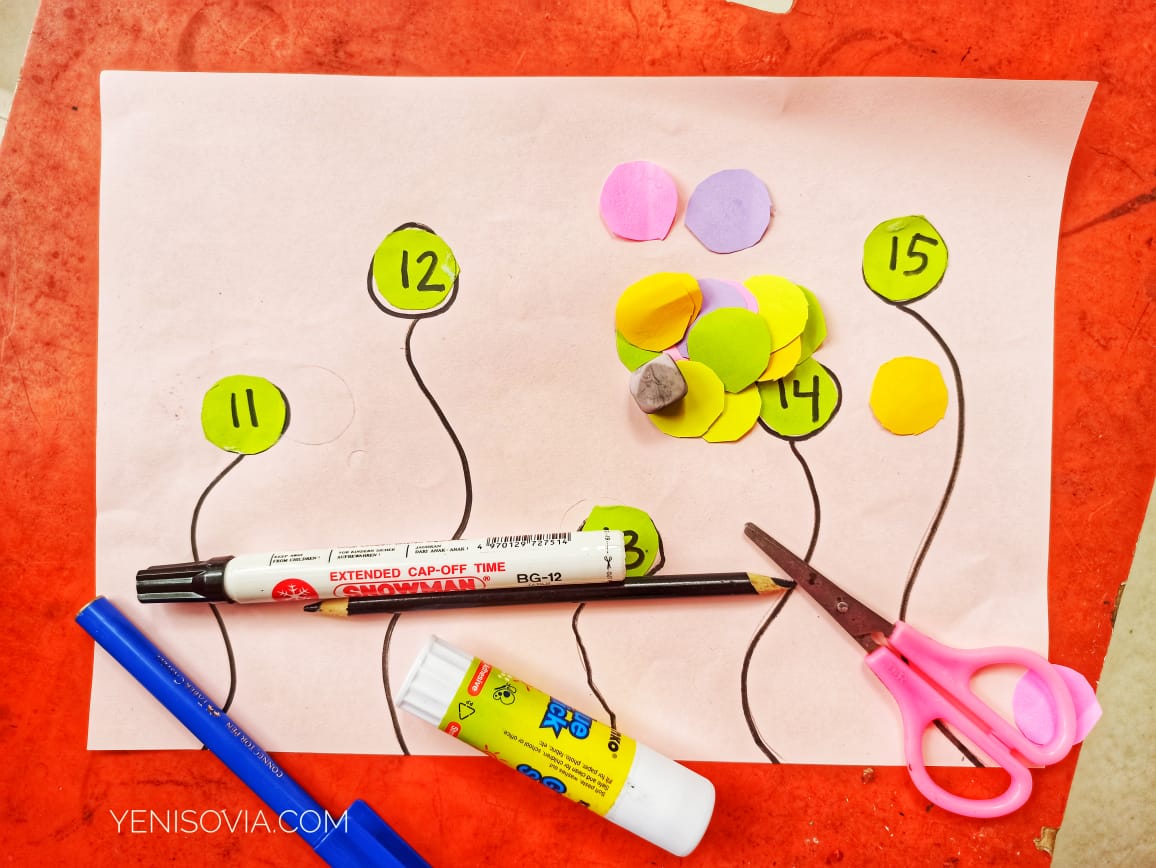 Nah, karena Erysha sudah mengenal dan tahu angka 1 - 10. Jadi, beberapa waktu yang lalu aku kenalkan angka baru yaitu 11 - 15 dengan kegiatan kreativitas yaitu membuat bunga angka.