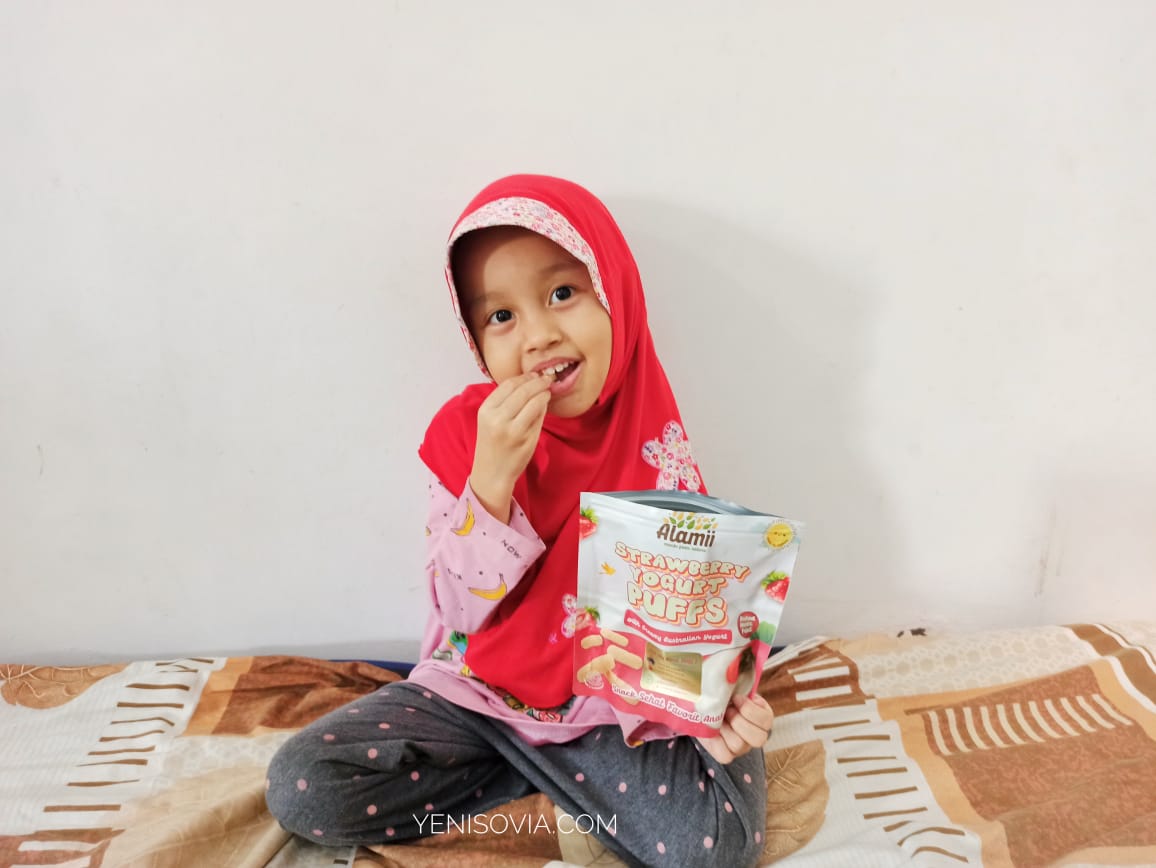 Nah, berbicara tentang camilan sehat, aku dan Erysha di rumah lagi coba camilan sehat dari Alami Puffs nih 😍.
