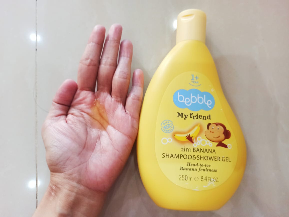 Teksturnya berwarna kuning bening. Nggak terlalu pekat dan nggak terlalu cair. Mudah diaplikasikan dan kasih sedikit saja air langsung busanya melimpah jadi cocok banget nih mandi sambil main balon sabun bersama anak kita. Kalau Wanginya wangi pisang dan enak enak aja
