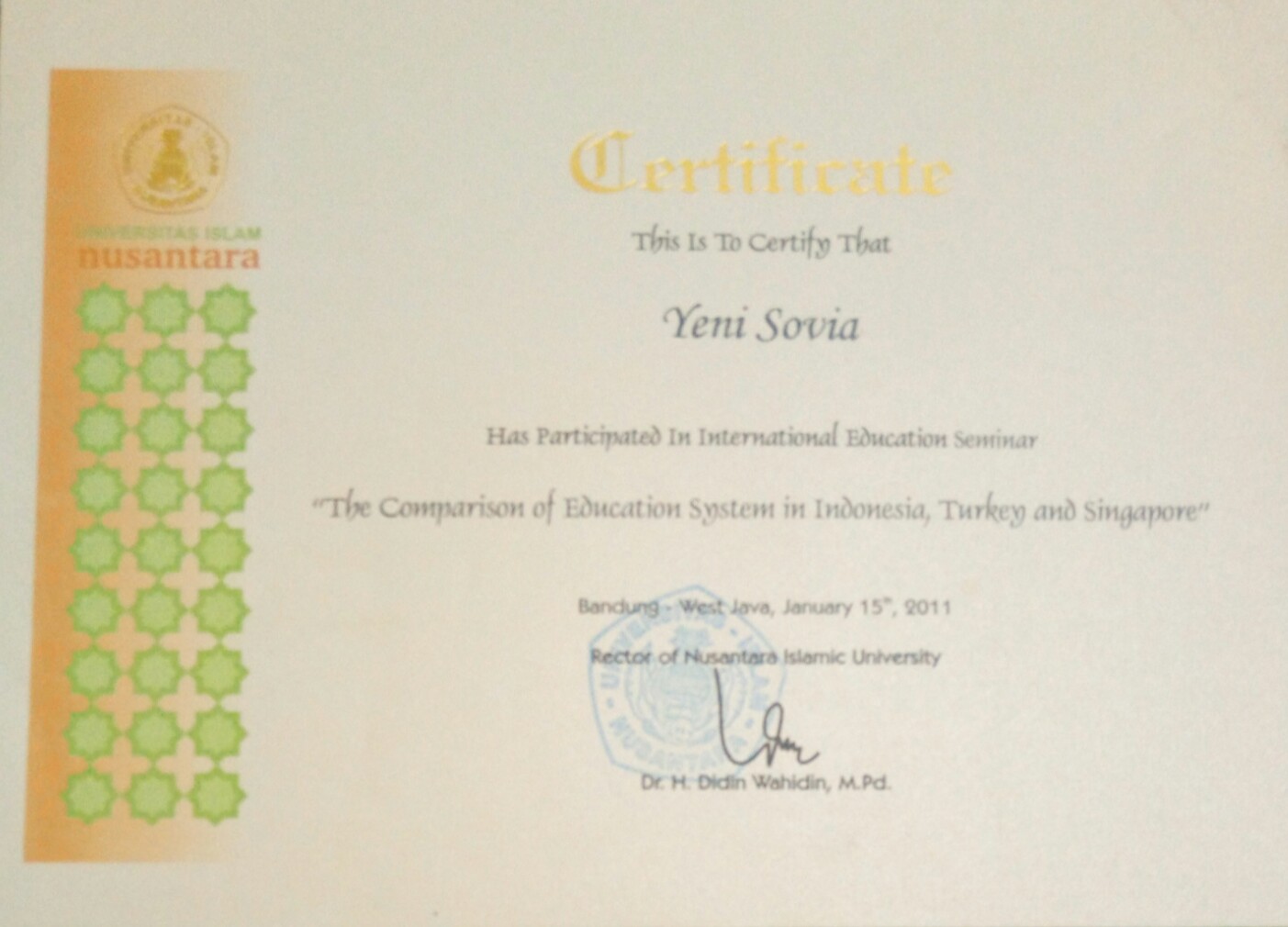 Salah satu sertifikat seminar pendidikan internasional yang pernah diikuti |
